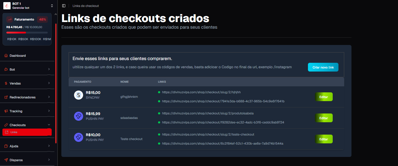- Dois links prontos: cada checkout gera 2 links (slug legÃvel + link único). Use o que preferir.