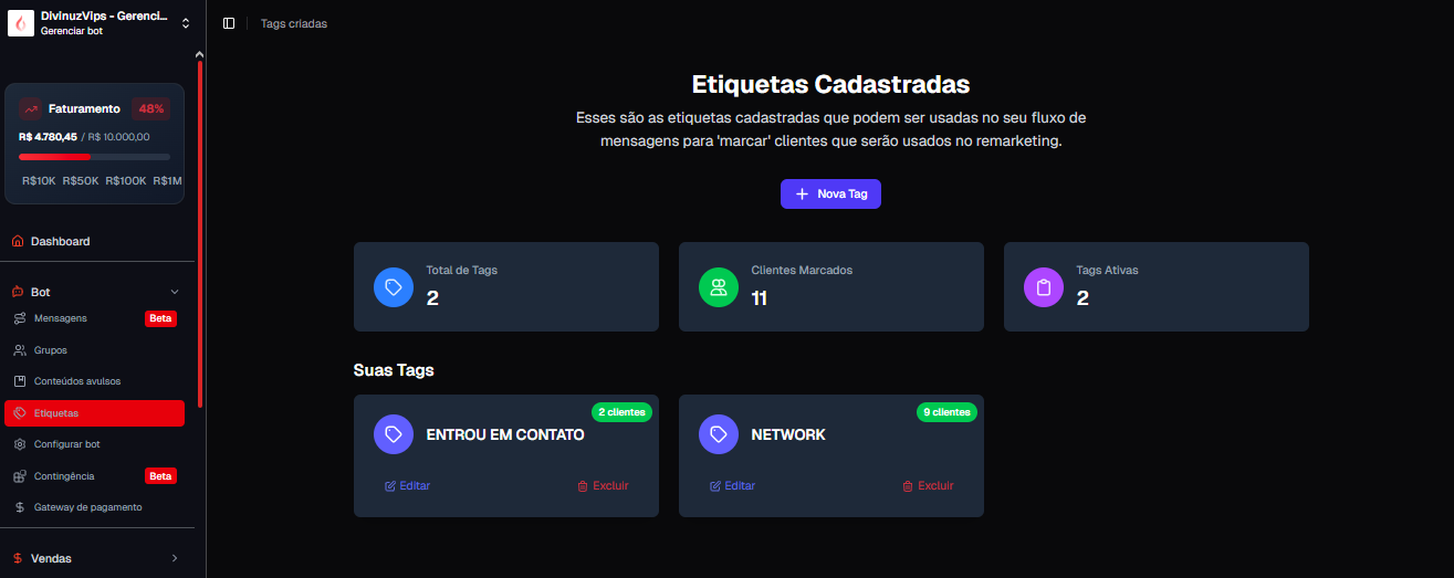 As Etiquetas da Divinuz são o motor da automação inteligente. Com elas, você marca, identifica e entende o comportamento de cada cliente dentro do seu funil — automaticamente, sem precisar mover um dedo. Crie tags estratégicas e descubra quem comprou, quem clicou, quem demonstrou interesse ou quem ainda está decidindo.