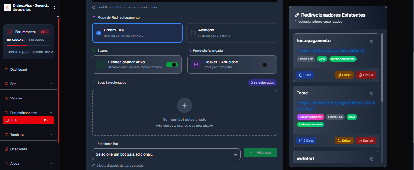 Para quem quer manter seus funis e bots seguros, a Divinuz oferece a Proteção Avançada. Ativando Cloaker + Anticlone, você garante que seu conteúdo seja acessado apenas por usuários reais, evitando cópias indevidas e bloqueios desnecessários.